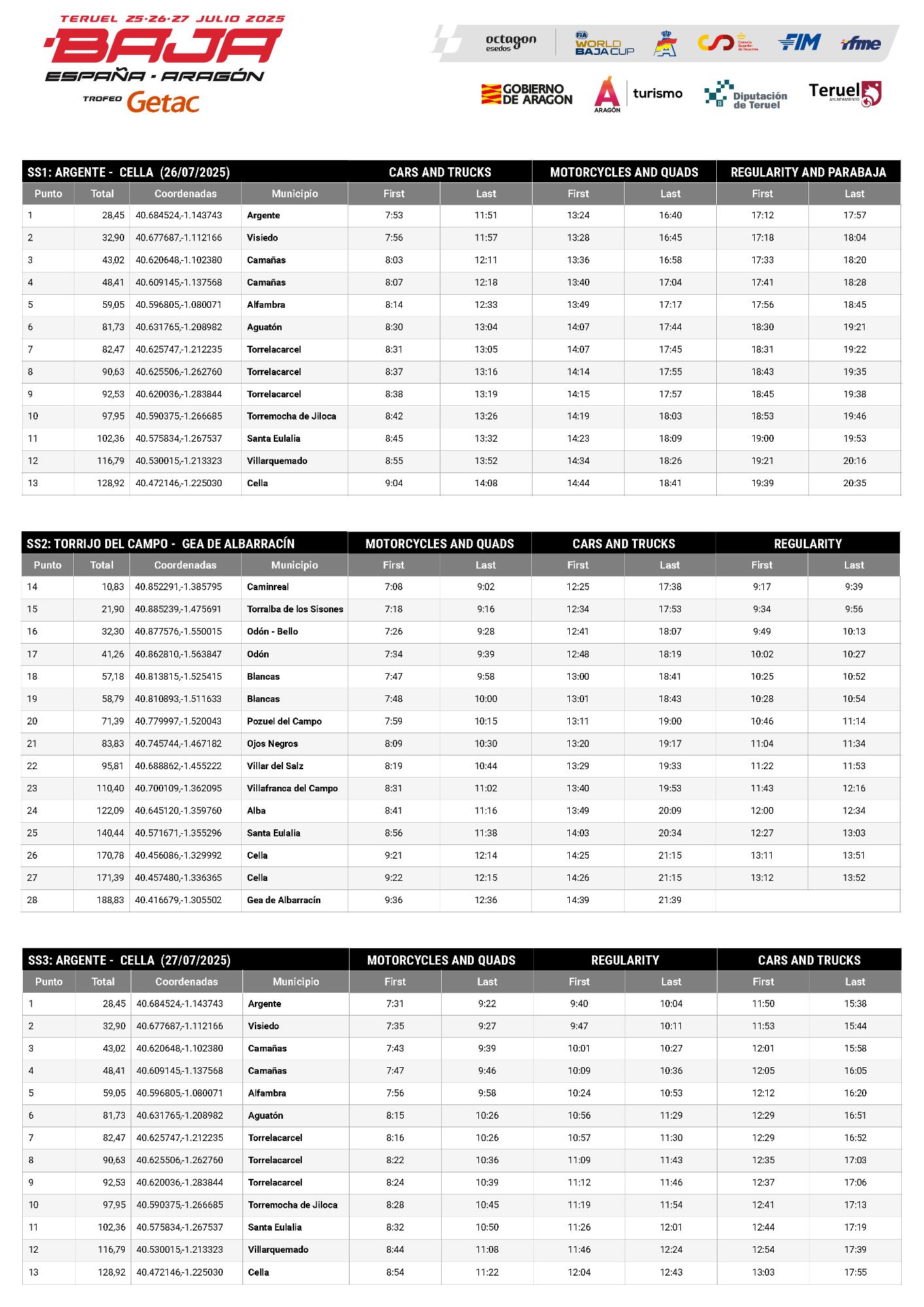 Si querés acercarte a ver pasar a los vehículos de la Baja Aragón 2025, tomá nota de los horarios aproximados en que pasarán los primeros competidores por cada municipio. Recordá que estos horarios corresponden a los primeros de cada categoría: Coches y Camiones, Motos y Quads, y Regularidad/Parabaja.