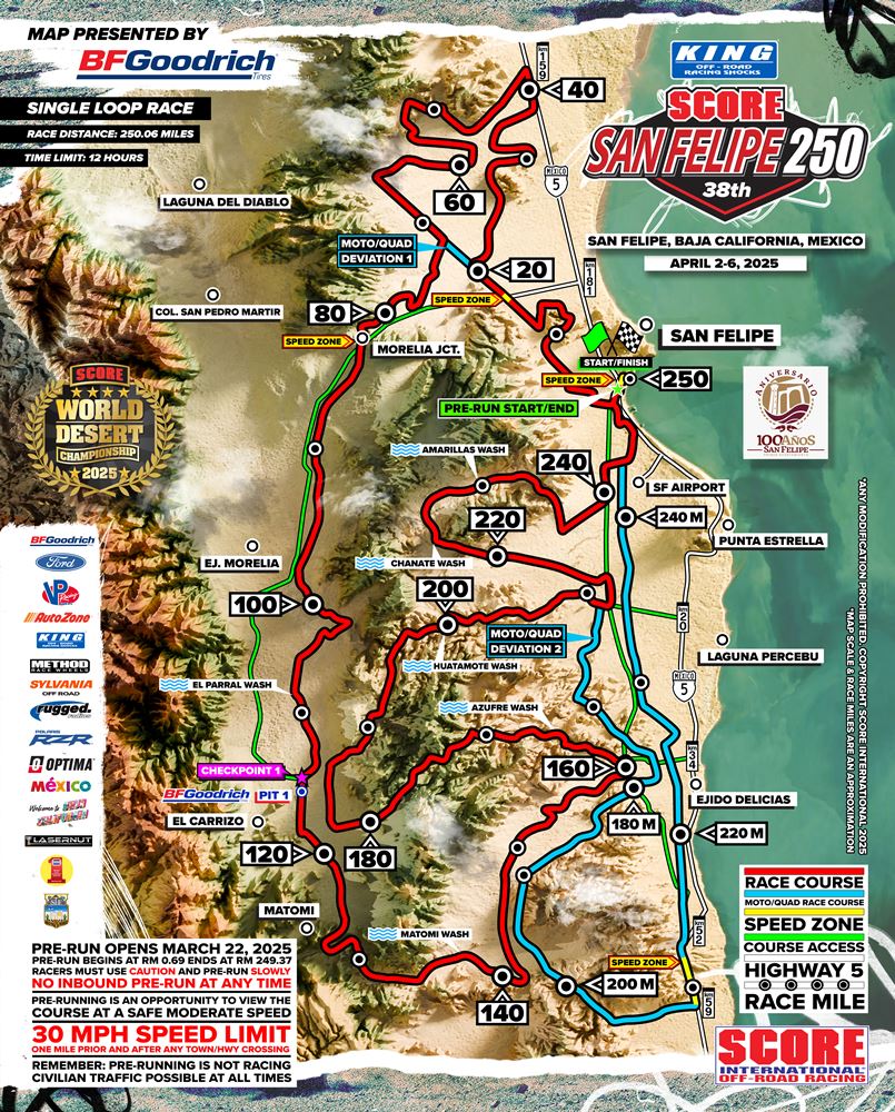 Para la edición 38 de la King Shocks SCORE San Felipe 250, la organización reveló el trazado oficial, disponible en www.score-international.com. La competencia se celebrará del 2 al 6 de abril en el puerto pesquero de San Felipe, Baja California, México, y contará con la presencia de algunos de los mejores pilotos del mundo.