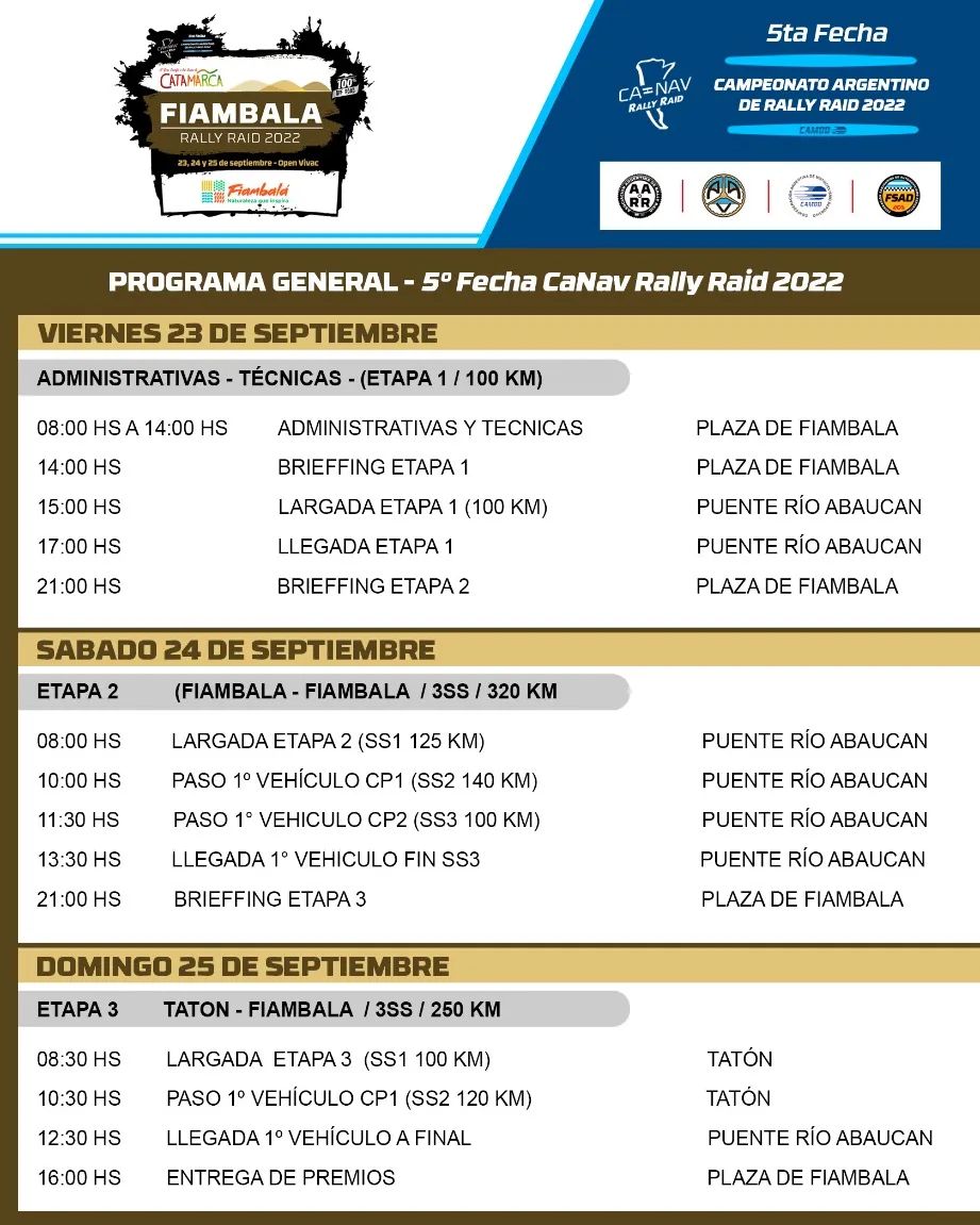 La organización del Canav dispuso un cronograma dividido en tres jornadas, comenzando el viernes por la mañana con las verificaciones técnicas y administrativas. A la tarde, se llevará a cabo la etapa 1, con 100 kilómetros de recorrido y una largada grupal estilo motocross. Por la noche, se realizará la largada simbólica en el centro de Fiambalá, donde los fanáticos podrán acercarse para ver las máquinas ya a sus pilotos favoritos.