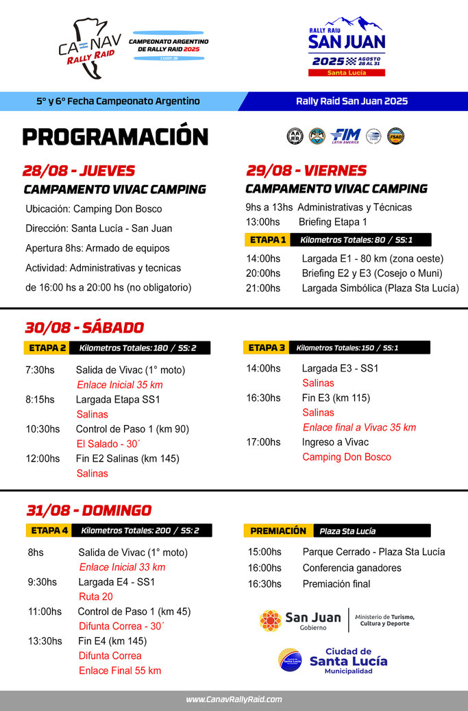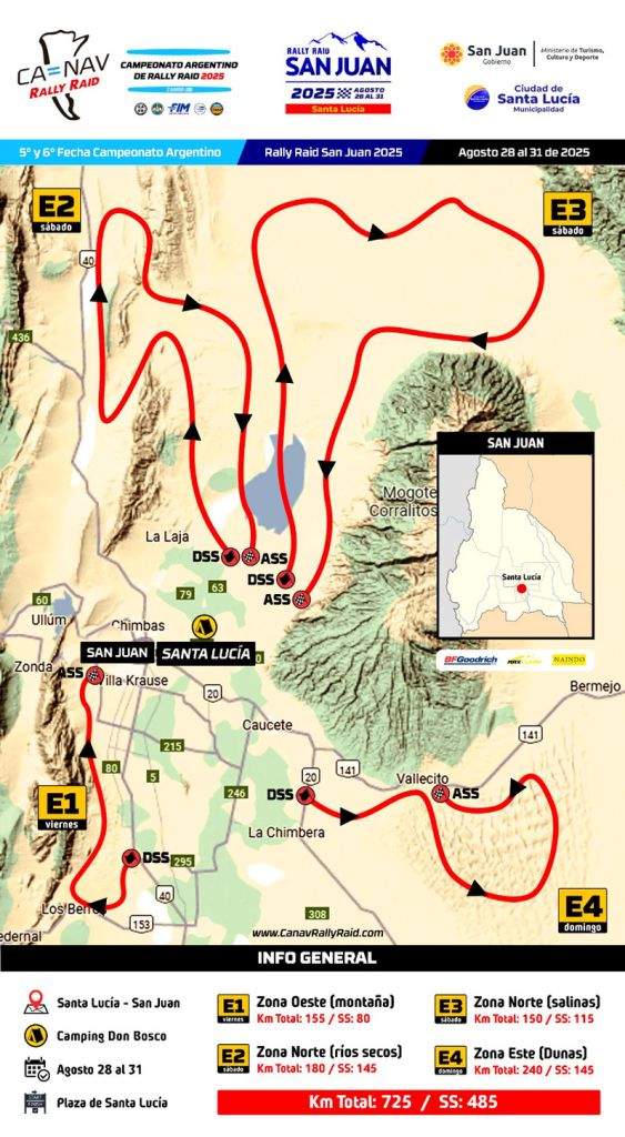 De esta manera, los mapas señalan 725 kilómetros totales, con 485 kilómetros de especial. Sin dudas, un recorrido muy exigente donde se demostrará la gran variedad de recorridos que permite la provincia de San Juan.