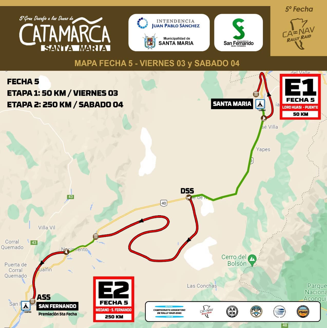 El viernes será el inicio de la quinta fecha con la etapa 1, que consistirá de un bucle de 50 kilómetros de tramo cronometrado alrededor de Santa María. Esta fecha 5 finalizará el sábado al mediodía, luego de la etapa 2, entre Santa María y San Fernando, con 170 kilómetros de especial.