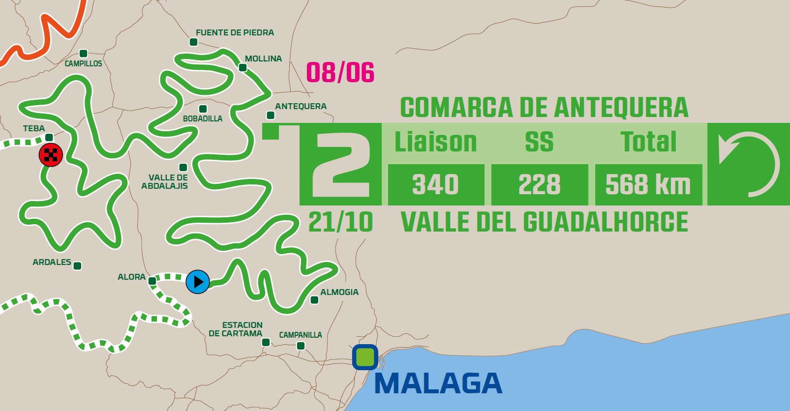 Los vehículos partirán del Vivac del Gran Hipódromo de Andalucía en enlace hasta Alora. Allí, tomarán la largada y pasarán por las cercanías de Estación de Cartama, Campanilla, Almogia, Valle de Abdalajis, Antequera, Mollina, Fuente de Piedra, Bobadilla, Campillos, Aradales, Serrato y finalizarán la especial en Teba. Todo este tramo cronometrado se dará muy cerca de la ciudad de Málaga.