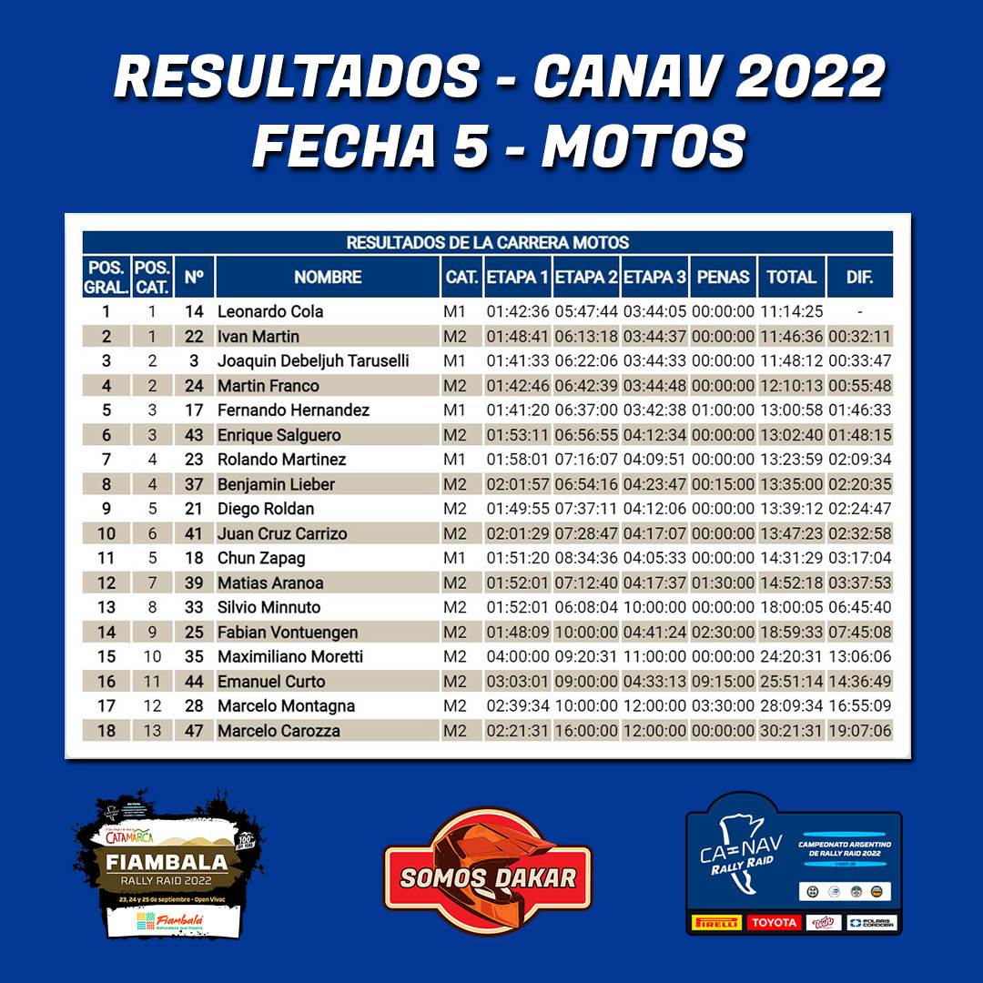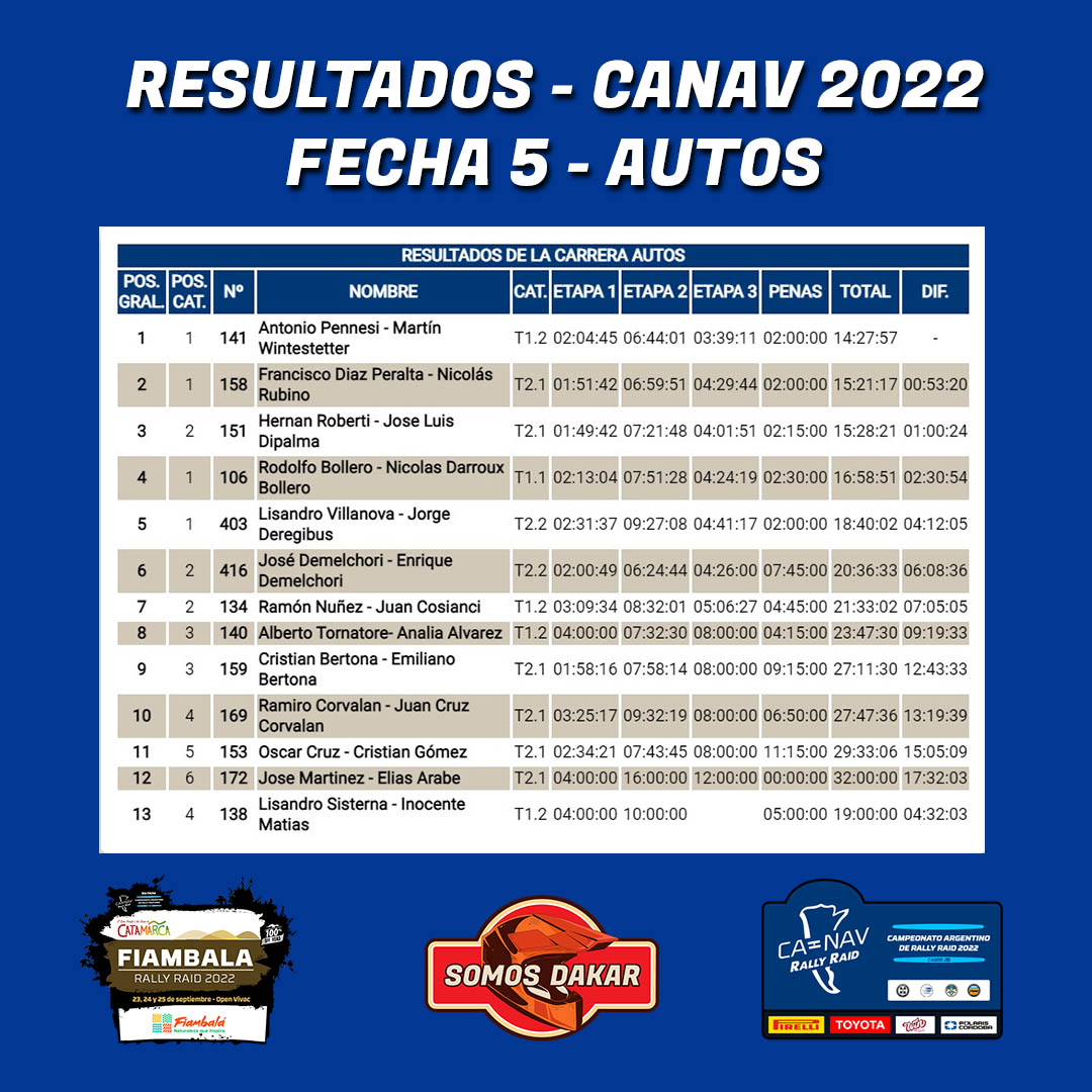 La quinta fecha del Campeonato Argentino de Rally Raid se disputó el fin de semana en Fiambalá, Catamarca, donde el desierto, la arena y las dunas dejaron más que satisfechos a aquellos pilotos que se animaron a disputar el desafío. Luego de tres días de competencia, conocemos los ganadores de cada una de las categorías.