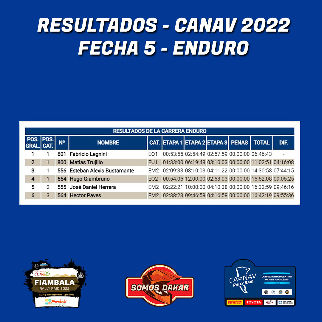 En la categoría Enduro, Fabricio Legnini se impuso con contundencia en la general, con Matías Trujillo y Esteban Alexis Bustamante detrás. Hugo Giambruno, José Herrera y Héctor Paves cerraron la clasificación de la nueva categoría que debutó este año.