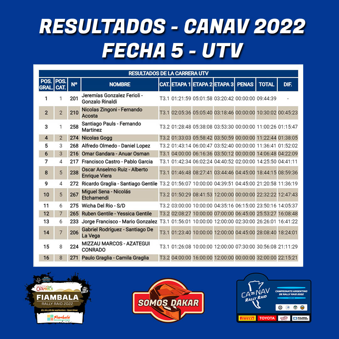 Del lado de los UTV T3.1, Jeremías González Ferioli – Gonzalo Rinaldi se impuso con autoridad en Fiambalá con 45 minutos de diferencia sobre Nicolás Zingoni – Fernando Acosta. El histórico Omar Gándara – Anuar Osman lograron el top 3 de la categoría principal de los SSV.