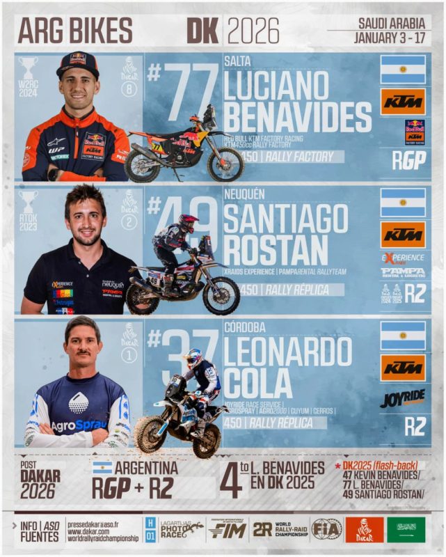 Entre las motos, Luciano Benavides e Ignacio Cornejo serán los dos representantes en la divisional principal, Rally GP. Tanto el de KTM como el de Hero ya poseen mucha experiencia dakariana, por lo que no dudarán en acelerar e ir por la victoria desde el primer momento.