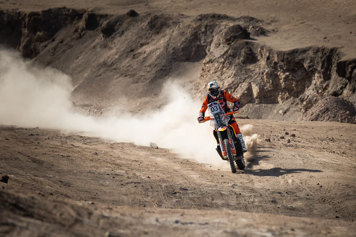 KEVIN BENAVIDES (KTM) Motos: “Fue una linda etapa para iniciar el rally, aunque cometí un error de navegación en una zona, donde me perdí por algunos kilómetros, pero al final hemos remontado un poco. Me gusta correr en Chile porque es divertido correr por terrenos diverso, con diferentes tipos de piso, muy técnico”.