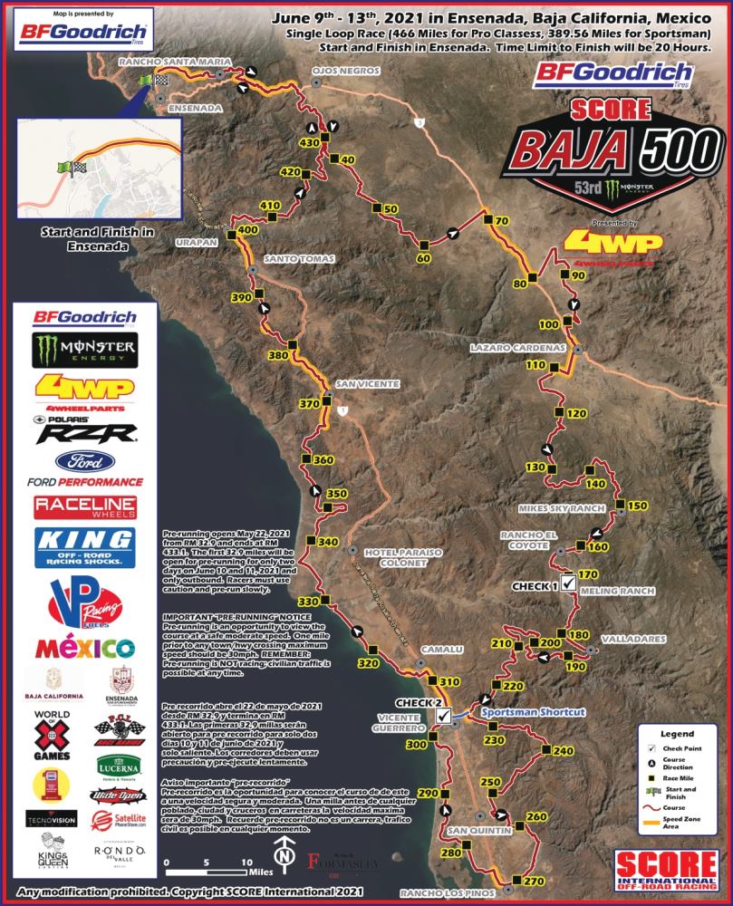 Score International publicó el mapa oficial de la Baja 500, que se disputará durante la segunda semana de junio de 2021. Vea la información, junto con el cronograma del evento y la lista de inscriptos