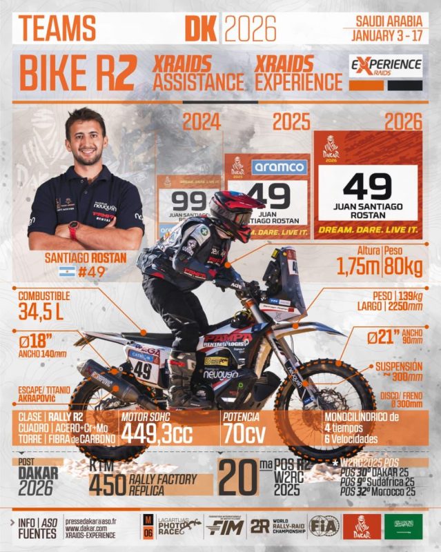El Dakar 2026 se disputará del 3 al 17 de enero en Arabia Saudita. Santiago Rostan estará compitiendo en la categoría Motos Rally2.