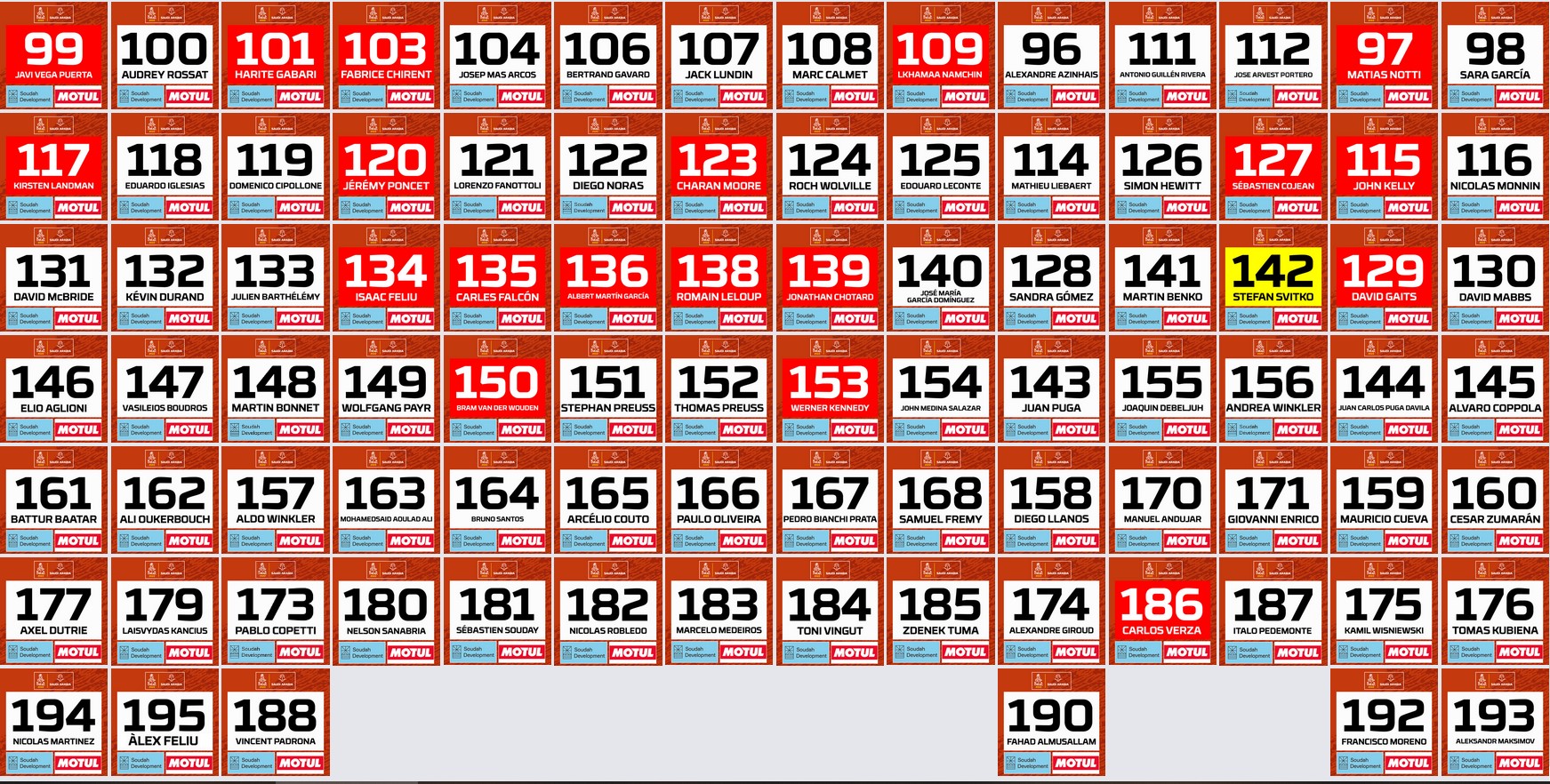 Joan Barreda Bort, por su parte, ocupará el número 88, debido a que se asemeja a la doble BB de su apellido. Stefan Svitko, curiosamente irá con el 142, aunque será distinguible por el fondo amarillo que representa a aquellos pilotos de élite.