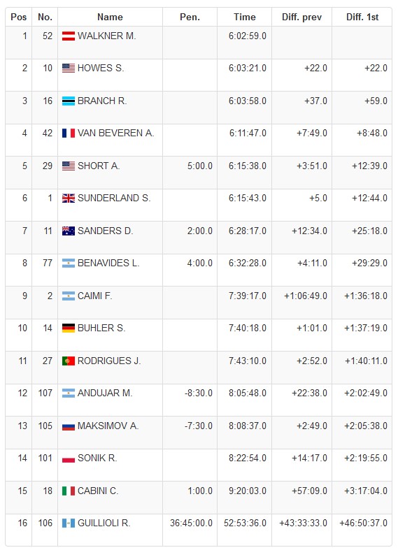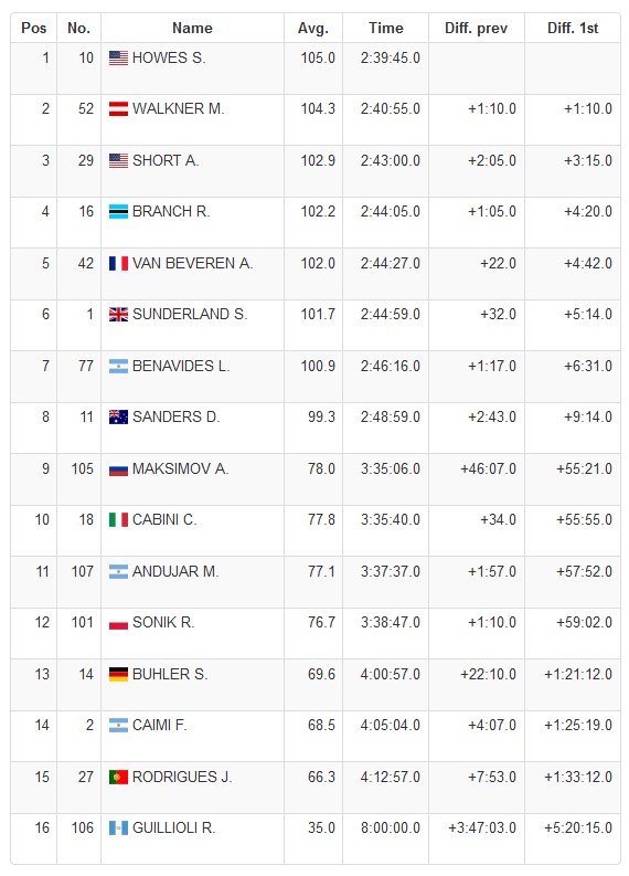 Con estos resultados, Matthias Walkner es entonces el nuevo líder, dejando detrás a Skyler Howes y a Ross Branch, a apenas 22 segundos y 59 segundos, respectivamente.