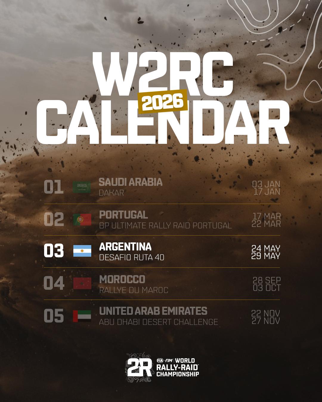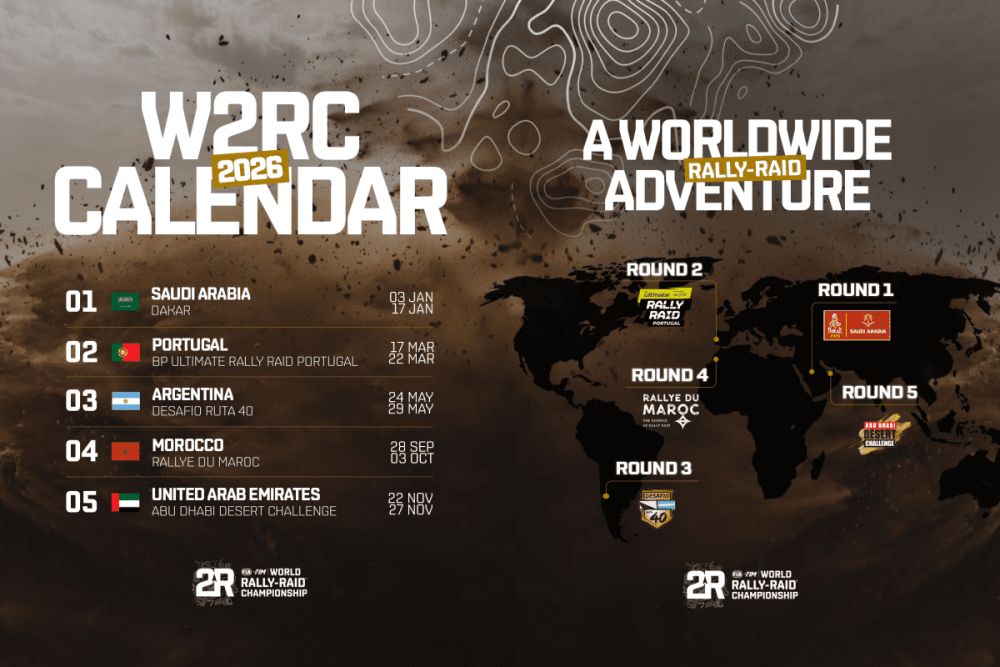 La temporada 2026 del W2RC comenzará con el mítico Rally Dakar, del 3 al 17 de enero. Luego, la caravana tornará hacia Europa para el Rally Raid de Portugal, del 17 al 22 de marzo. La tercera fecha será el Desafío Ruta 40, en tanto que la cuarta será el Rallye du Maroc, del 28 de septiembre al 3 de octubre. Finalmente, el calendario se cierra con el Abu Dhabi Desert Challenge, del 22 al 27 de noviembre.